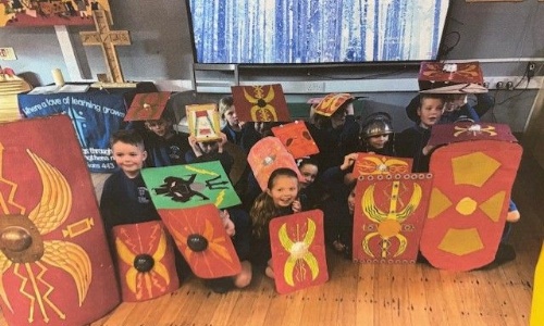 Kingfisher class took part in a Roman v Celt battle this week. They made shields at home as part of their homework and topic work about The Romans. They look great in action and their shields look so good in the corridor on display. Thank you to all the children and parents who took the time to create such fabulous homework.